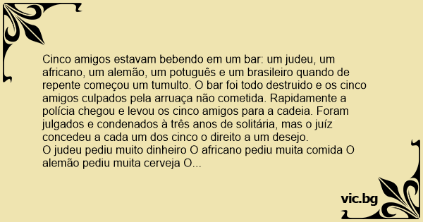 Cinco amigos estavam bebendo em um bar: um judeu, um africano, um alemão, um potuguês e um brasileiro quando de repente começou um tumulto. O bar foi todo destruido e os cinco amigos culpados pela arruaça não cometida. Rapidamente a polícia chegou e levou os cinco amigos para a cadeia. Foram julgados e condenados à três anos de solitária, mas o juíz concedeu a cada um dos cinco o direito a um desejo.