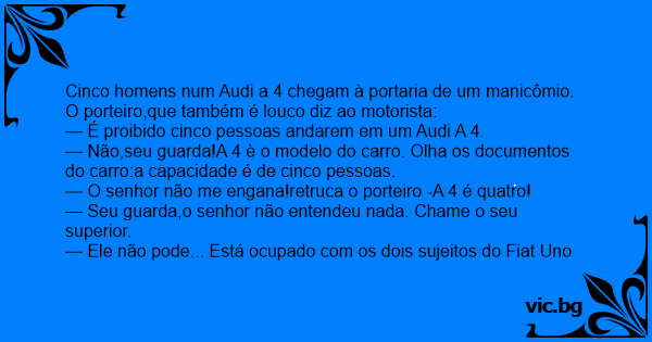 Cinco homens num Audi a 4 chegam à portaria de um manicômio. O porteiro,que também é louco diz ao motorista: