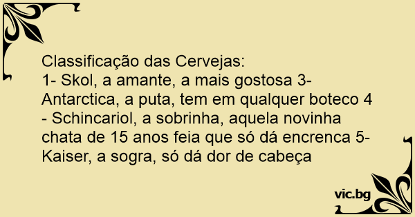 1- Skol, a amante, a mais gostosa 3- Antarctica, a рuта, tem em qualquer boteco 4- Schincariol, a sobrinha, aquela novinha chata de 15 anos feia que só dá encrenca 5- Kaiser, a sogra, só dá dor de cabeça