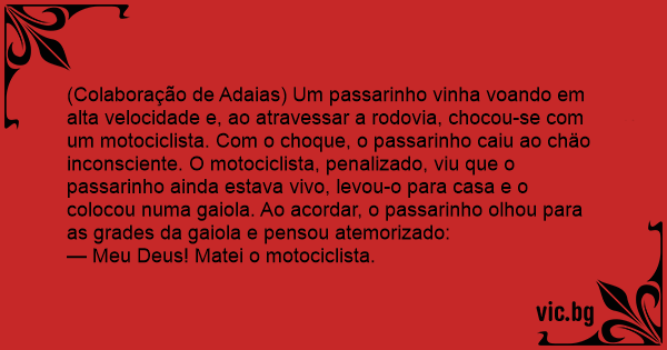 (Colaboração de Adaias) Um passarinho vinha voando em alta velocidade e, ao atravessar a rodovia, chocou-se com um motociclista. Com o choque, o passarinho caiu ao chäo inconsciente. O motociclista, penalizado, viu que o passarinho ainda estava vivo, levou-o para casa e o colocou numa gaiola. Ao acordar, o passarinho olhou para as grades da gaiola e pensou atemorizado:
