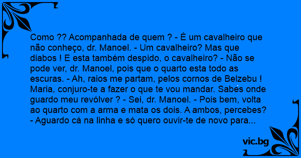 Como ?? Acompanhada de quem ? - É um cavalheiro que não conheço, dr. Manoel. - Um cavalheiro? Mas que diabos ! E esta também despido, o cavalheiro? - Não se pode ver, dr. Manoel, pois que o quarto esta todo as escuras. - Ah, raios me partam, pelos cornos de Belzebu ! Maria, conjuro-te a fazer o que te vou mandar. Sabes onde guardo meu revólver ? - Sei, dr. Manoel. - Pois bem, volta ao quarto com a arma e mata os dois. A ambos, percebes? - Aguardo cá na linha e só quero ouvir-te de novo para me dizeres que estão mortos. Vai! - Esta bem, dr. Manoel. (tempo) Pronto, dr. Manoel, fiz o que o doutor mandou. - Mataste ? Os dois ? - (ofegante) Matei, dr. Manoel. Entrei ao quarto e consegui atingir dona Maria ao primeiro disparo, mas o cavalheiro escapuliu pelo corredor e tive que ir-lhe ao encalco. Correu de mim de assoalhada em assoalhada, de lanço em lanço, de patamar em patamar, escoriou-se todo na mobília, e disparei varias vezes, sem atingi-lo. Mesmo despido, saltou a janela ao jardim e corria a galgar o muro, quando consegui mirar o último disparo. Ele cambaleou e caiu morto a piscina... - Com? Piscina? De onde estão a falar? Ih, e engano!