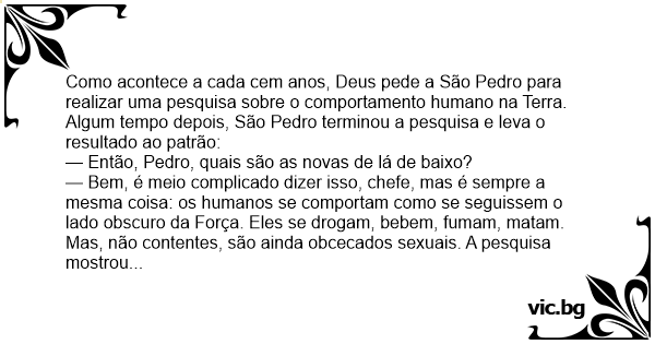 Como acontece a cada cem anos, Deus pede a São Pedro para realizar uma pesquisa sobre o comportamento humano na Terra. Algum tempo depois, São Pedro terminou a pesquisa e leva o resultado ao patrão: