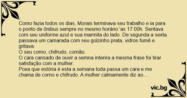 Poxa que estória é esta a semana toda passa um cara e me chama de соrnо e chifrudo. A mulher calmamente diz ao marido: