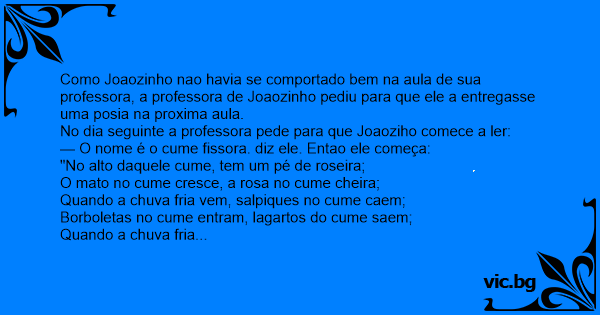 Como Joaozinho nao havia se comportado bem na aula de sua professora, a professora de Joaozinho pediu para que ele a entregasse uma posia na proxima aula.