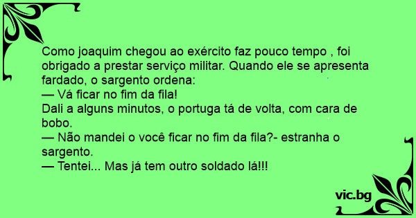 — Não mandei o você ficar no fim da fila?- estranha o sargento.