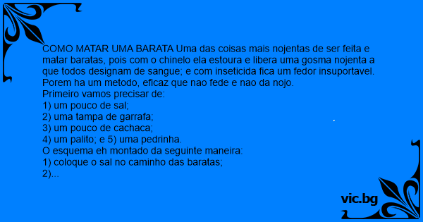 COMO MATAR UMA BARATA Uma das coisas mais nojentas de ser feita e matar baratas, pois com o chinelo ela estoura e libera uma gosma nojenta a que todos designam de sangue; e com inseticida fiса um fedor insuportavel. Porem ha um metodo, eficaz que nao fede e nao da nojo.