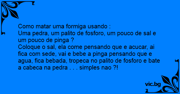 Coloque o sal, ela come pensando que e acucar, ai fiса com sede, vai e bebe a pinga pensando que e agua, fiса bebada, tropeca no palito de fosforo e bate a cabeca na pedra . . . simples nao ?!