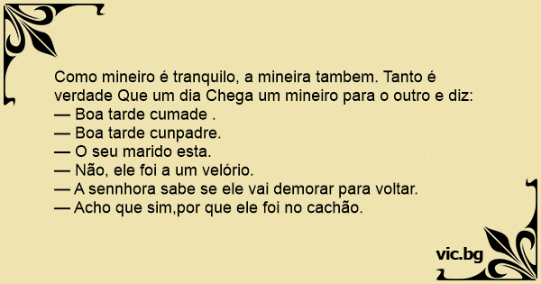 Como mineiro é tranquilo, a mineira tambem. Tanto é verdade Que um dia Chega um mineiro para o outro e diz: