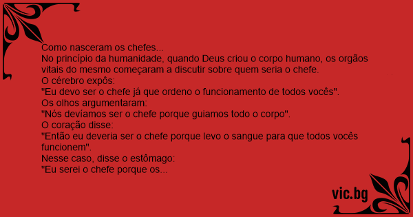 No princípio da humanidade, quando Deus criou o corpo humano, os orgãos vitais do mesmo começaram a discutir sobre quem seria o chefe.