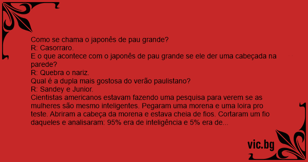 Cientistas americanos estavam fazendo uma pesquisa para verem se as mulheres são mesmo inteligentes. Pegaram uma morena e uma loira pro теsте. Abriram a cabeça da morena e estava cheia de fios. Cortaram um fio daqueles e analisaram: 95% era de inteligência e 5% era de fofocas e essas coisas de mulher. Abriram a cabeça da loira e só encontraram um fio. Eles o cortaram. O que aconteceu em seguida?