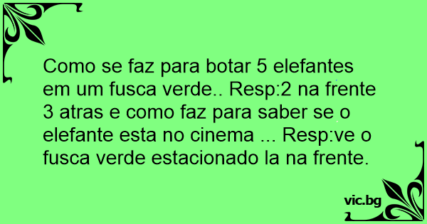 Como se faz para botar 5 elefantes em um fusca verde.. Resp:2 na frente 3 atras e como faz para saber se o elefante esta no cinema ... Resp:ve o fusca verde estacionado la na frente.
