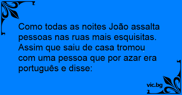 Como todas as noites João assalta pessoas nas ruas mais esquisitas. Assim que saiu de casa tromou com uma pessoa que por azar era português e disse: