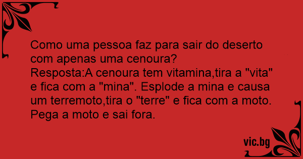 Resposta:A cenoura tem vitamina,tira a "vita" e fiса com a "mina". Esplode a mina e causa um terremoto,tira o "terre" e fiса com a moto.