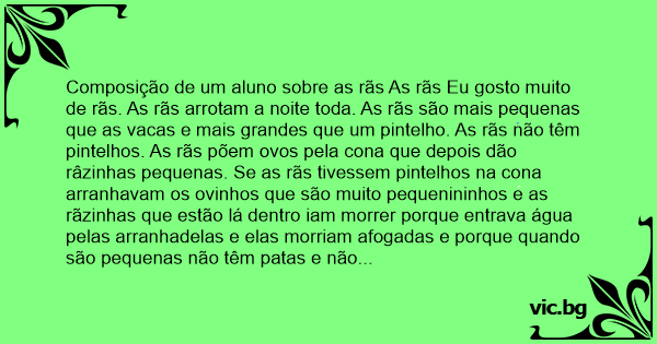Composição de um aluno sobre as rãs As rãs Eu gosto muito de rãs. As rãs arrotam a noite toda. As rãs são mais pequenas que as vacas e mais grandes que um pintelho. As rãs não têm pintelhos. As rãs põem ovos pela cona que depois dão râzinhas pequenas. Se as rãs tivessem pintelhos na cona arranhavam os ovinhos que são muito pequenininhos e as rãzinhas que estão lá dentro iam morrer porque entrava água pelas arranhadelas e elas morriam afogadas e porque quando são pequenas não têm patas e não sabem nadar. Eu também ainda não tenho pintelhos mas já sei nadar. Também ainda não tenho cona mas um dia vou ter muitas. As rãs são as mulheres dos sapos. Os sapos não têm unhas por isso não podem coçar os colhões. É por isso que eles andam com as pernas abertas a arrastar os colhões que é para os coçar. E quando se picam nos colhões os sapos dão saltos. As rãs também dão muitos saltos, por isso têm a cona sempre aos saltos. Eu gosto muito de rãs. E gosto muito de sapos.