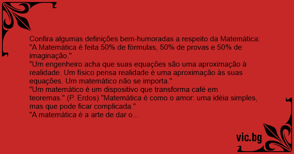 "Um matemático é um dispositivo que transforma café em teoremas." (P. Erdos) "Matemática é como o amor: uma idéia simples, mas que pode ficar complicada."