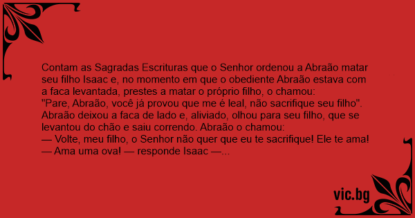 Contam as Sagradas Escrituras que o Senhor ordenou a Abraão matar seu filho Isaac e, no momento em que o obediente Abraão estava com a faca levantada, prestes a matar o próprio filho, o chamou: