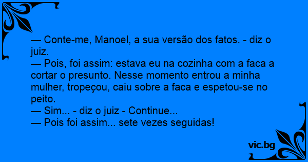 — Pois, foi assim: estava eu na cozinha com a faca a cortar o presunto. Nesse momento entrou a minha mulher, tropeçou, caiu sobre a faca e espetou-se no peito.