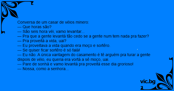 — Eu não. A única vantagem do casamento é tê arguém pra turar a gente dispois de véio, eu queria era vortá a sê moço, uai.