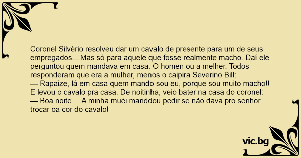 Coronel Silvério resolveu dar um cavalo de presente para um de seus empregados... Mas só para aquele que fosse realmente macho. Daí ele perguntou quem mandava em casa. O homen ou a melher. Todos responderam que era a mulher, menos o caipira Severino Bill: