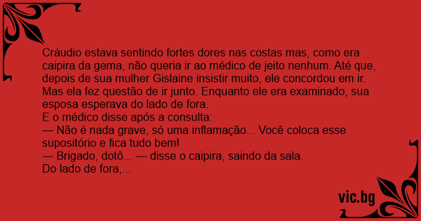 Cráudio estava sentindo fortes dores nas costas mas, como era caipira da gema, não queria ir ao médico de jeito nenhum. Até que, depois de sua mulher Gislaine insistir muito, ele concordou em ir. Mas ela fez questão de ir junto. Enquanto ele era examinado, sua esposa esperava do lado de fora.