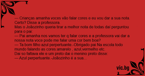 — Crianças amanha voces vão falar cores e eu vou dar a sua nota. Certo? Disse a professora.