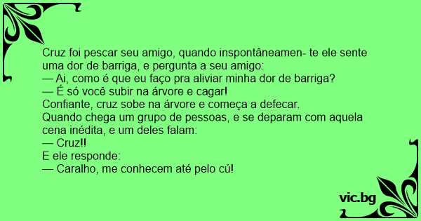 Cruz foi pescar seu amigo, quando inspontâneamen- te ele sente uma dor de barriga, e pergunta a seu amigo: