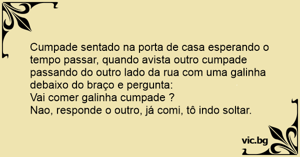 Cumpade sentado na porta de casa esperando o tempo passar, quando avista outro cumpade passando do outro lado da rua com uma gаlinhа debaixo do braço e pergunta: