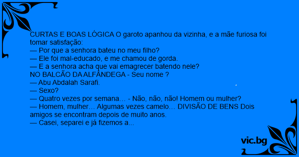 CURTAS E BOAS LÓGICA O garoto apanhou da vizinha, e a mãe furiosa foi tomar satisfação: