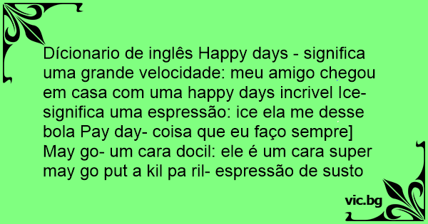 Dícionario de inglês Happy days - significa uma grande velocidade: meu amigo chegou em casa com uma happy days incrivel Ice- significa uma espressão: ice ela me desse bola Pay day- coisa que eu faço sempre] May go- um cara docil: ele é um cara super may go put a kil pa ril- espressão de susto