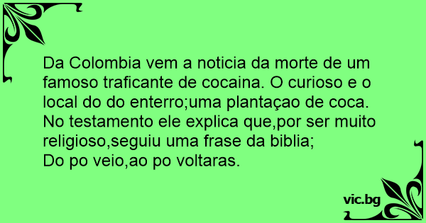 Da Colombia vem a noticia da morte de um famoso traficante de cocaina. O curioso e o local do do enterro;uma plantaçao de coca. No testamento ele explica que,por ser muito religioso,seguiu uma frase da biblia;