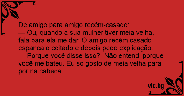 — Ou, quando a sua mulher tiver meia velha, fala para ela me dar. O amigo recém casado espanca o coitado e depois pede explicação.