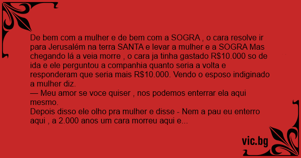 De bem com a mulher e de bem com a SOGRA , o cara resolve ir para Jerusalém na terra SANTA e levar a mulher e a SOGRA Mas chegando lá a veia morre , o cara ja tinha gastado R$10.000 so de ida e ele perguntou a companhia quanto seria a volta e responderam que seria mais R$10.000. Vendo o esposo indiginado a mulher diz.