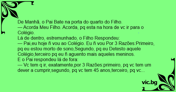 — Pai,eu hoje ñ vou ao Colégio. Eu ñ vou Por 3 Razões:Primeiro, pq eu estou morto de sono,Segundo, pq eu Detesto aquele Colégio,terceiro pq eu ñ aguento mais aqueles meninos.