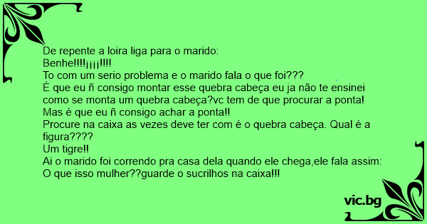 A loira telefona ao marido: — BENHê EU TO COM UM PROBLEMA GRANDE. — O que foi? — Eu comprei um quebra-cabeça e não sei montar!As peças não se encaicham. — Qual é a figura? — É um tigre. — Está bem,...