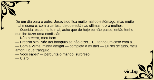 De um dia para o outro, Josevaldo fiса muito mal do estômago, mas muito mal mesmo e, com a certeza de que está nas últimas, diz à mulher: