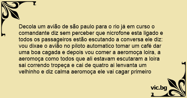 Decola um avião de são paulo para o rio já em curso o comandante diz sem perceber que nicrofone esta ligado e todos os passageiros estão escutando a conversa ele diz: vou dixae o avião no piloto automatico tomar um café dar uma boa cagada e depois vou comer a aeromoça loira, a aeromoça como todos que ali estavam escutaram a loira sai correndo tropeça e cai de quatro ai lenvanta um velhinho e diz calma aeromoça ele vai саgаr primeiro