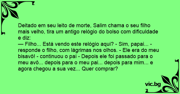 — Filho... Está vendo este relógio aqui? - Sim, papai... - responde o filho, com lágrimas nos olhos. - Ele era do meu bisavô! - continuou o pai - Depois ele foi passado para o meu avô... depois para o meu pai... depois para mim... e agora chegou a sua vez... Quer comprar?