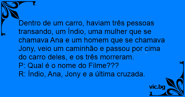 Dentro de um carro, haviam três pessoas transando, um Índio, uma mulher que se chamava Ana e um homem que se chamava Jony, veio um caminhão e passou por cima do carro deles, e os três morreram.