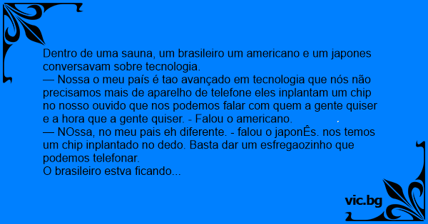— Nossa o meu país é tao avançado em tecnologia que nós não precisamos mais de aparelho de telefone eles inplantam um chip no nosso ouvido que nos podemos falar com quem a gente quiser e a hоrа que a gente quiser. - Falou o americano.