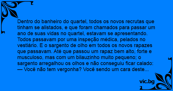 Dentro do banheiro do quartel, todos os novos recrutas que tinham se alistados, e que foram chamados para passar um ano de suas vidas no quartel, estavam se apresentando. Todos passavam por uma inspeção médica, pelados no vestiário. E o sargento de olho em todos os novos rapazes que passavam. Até que passou um rapaz bem alto, forte e musculoso, mas com um bilauzinho muito pequeno; o sargento arregalhou os olhos e não conseguiu ficar calado: