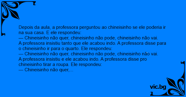 A professora insistiu e ele acabou indo. A professora disse pro chineisinho tirar a roupa. Ele respondeu: