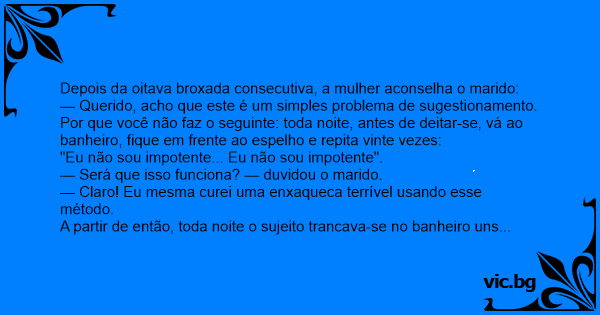 A partir de então, toda noite o sujeito trancava-se no banheiro uns dez minutos e fazia os exercícios recomendados pela mulher. Em poucas semanas ele estava totalmente curado.