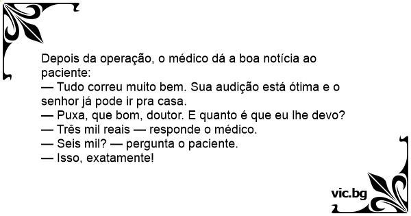 — Tudo correu muito bem. Sua audição está ótima e o senhor já pode ir pra casa.
