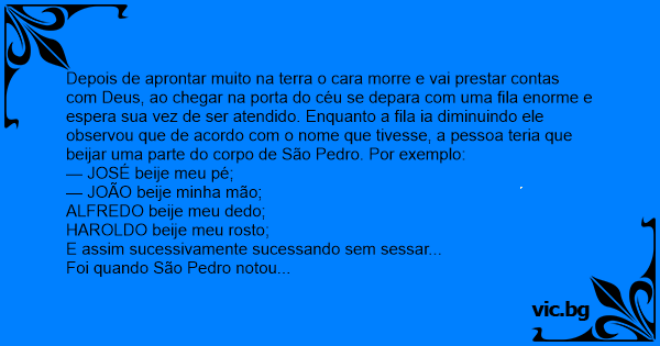 Depois de aprontar muito na terra o cara morre e vai prestar contas com Deus, ao chegar na porta do céu se depara com uma fila enorme e espera sua vez de ser atendido. Enquanto a fila ia diminuindo ele observou que de acordo com o nome que tivesse, a pessoa teria que beijar uma parte do corpo de São Pedro. Por exemplo: