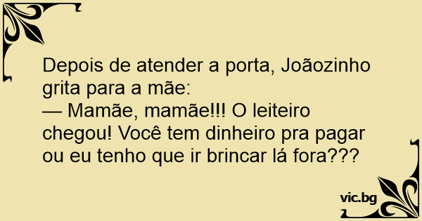 — Mamãe, mamãe!!! O leiteiro chegou! Você tem dinheiro pra pagar ou eu tenho que ir brincar lá fora???