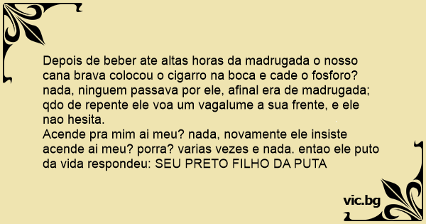 Acende pra mim ai meu? nada, novamente ele insiste acende ai meu? роrrа? varias vezes e nada. entao ele рuто da vida respondeu: SEU PRETO FILHO DA PUTA
