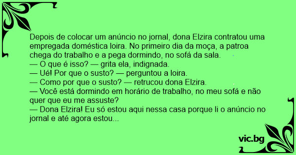 — Dona Elzira! Eu só estou aqui nessa casa porque li o anúncio no jornal e até agora estou fazendo tudo direitinho!