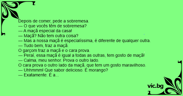 — Peraí, essa maçã é igual a todas as outras, tem gosto de maçã!
