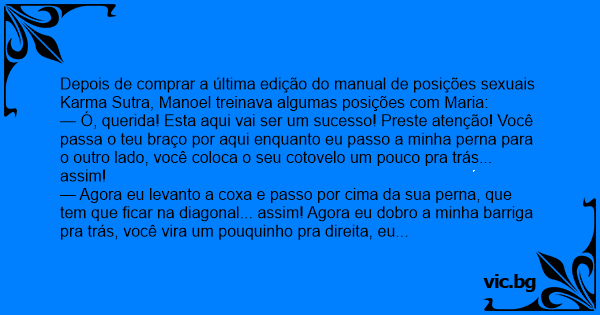 Depois de comprar a última edição do manual de posições sexuais Karma Sutra, Manoel treinava algumas posições com Maria: