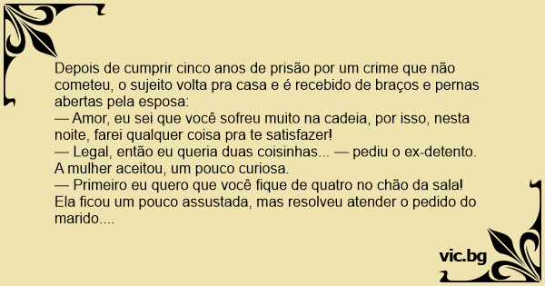 — Amor, eu sei que você sofreu muito na cadeia, por isso, nesta noite, farei qualquer coisa pra te satisfazer!